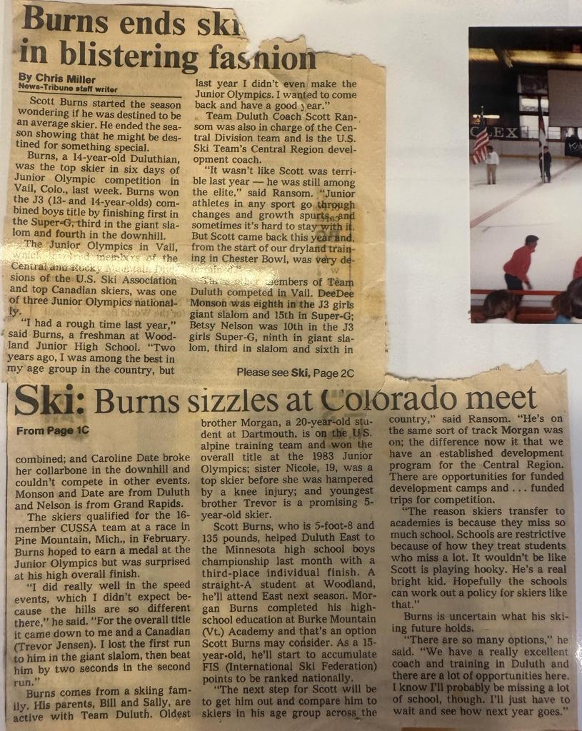 Today, Burns is active within the Afton Alps Alpine Race Club, where his two sons have both raced. Liam is a U16 with Afton. His oldest son, Caden, earned the Minnesota State Alpine Champion distinction in 2025 as a senior with the St. Paul Academy. Caden is now attending Williams College, Mass., and will race for their NCAA Division 1 Alpine Team.